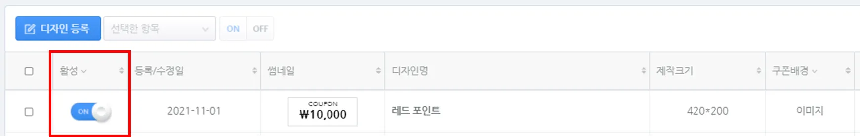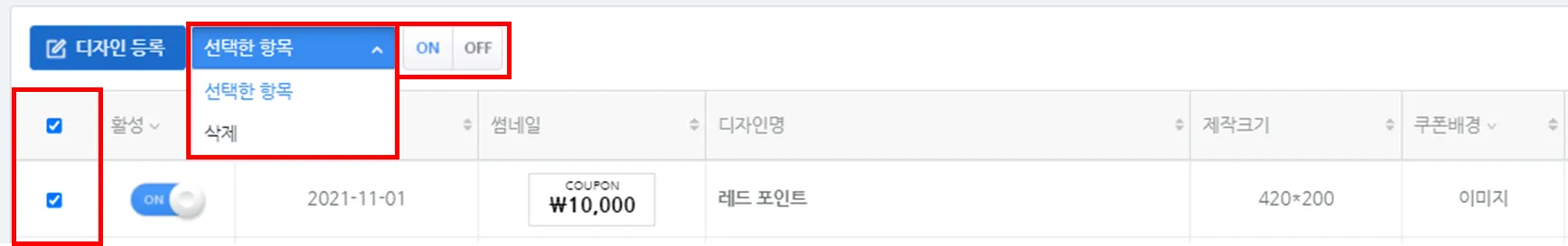 3) 다수의 디자인을 선택하여 상태 값을 ON/OFF 상태로 수정하거나 디자인을 삭제할 수 있습니다.