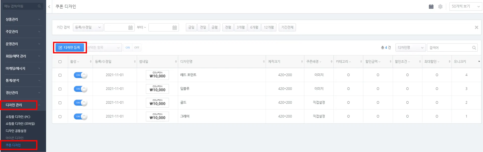 1) [디자인 관리 > 쿠폰 디자인] 메뉴에서 ‘디자인 등록’ 버튼을 클릭하면 새로운 쿠폰 디자인을 등록할 수 있습니다.