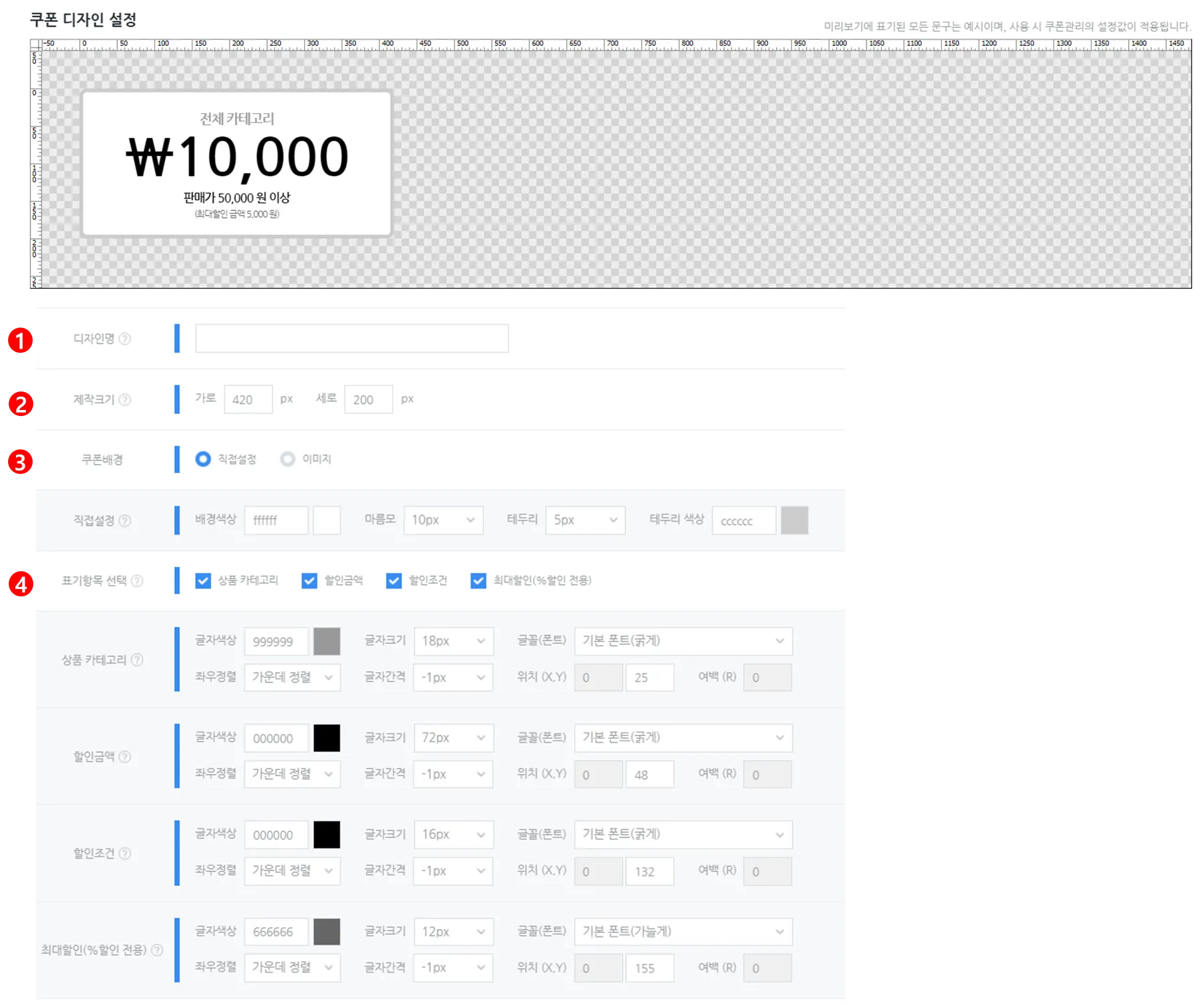 ① 디자인명 : 쿠폰의 디자인 제목을 입력합니다.