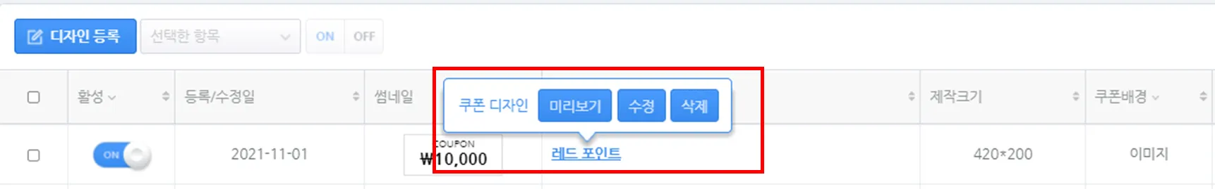 1) 등록된 쿠폰의 ‘디자인명’을 클릭하면 ‘미리보기’,’수정’,’삭제’ 가 가능합니다.