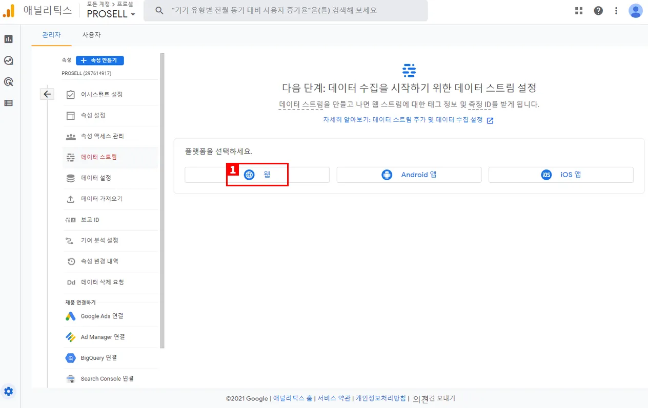 1) 데이터 스트림 설정에서 플랫폼은 ‘웹’으로 선택 합니다.
