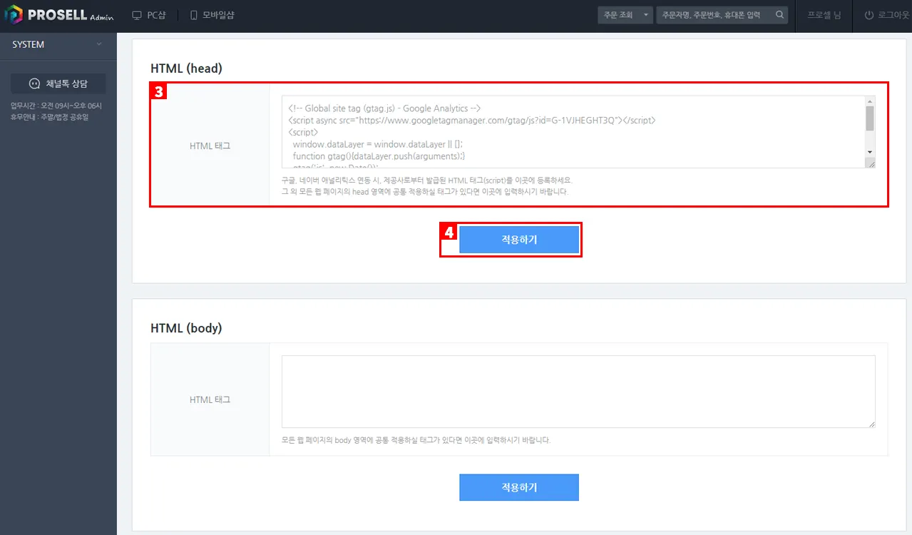 3) 프로셀 관리자 페이지의 쇼핑몰 설정 > 외부연동 설정 > 웹마스터 도구 > HTML (Head) 부분에