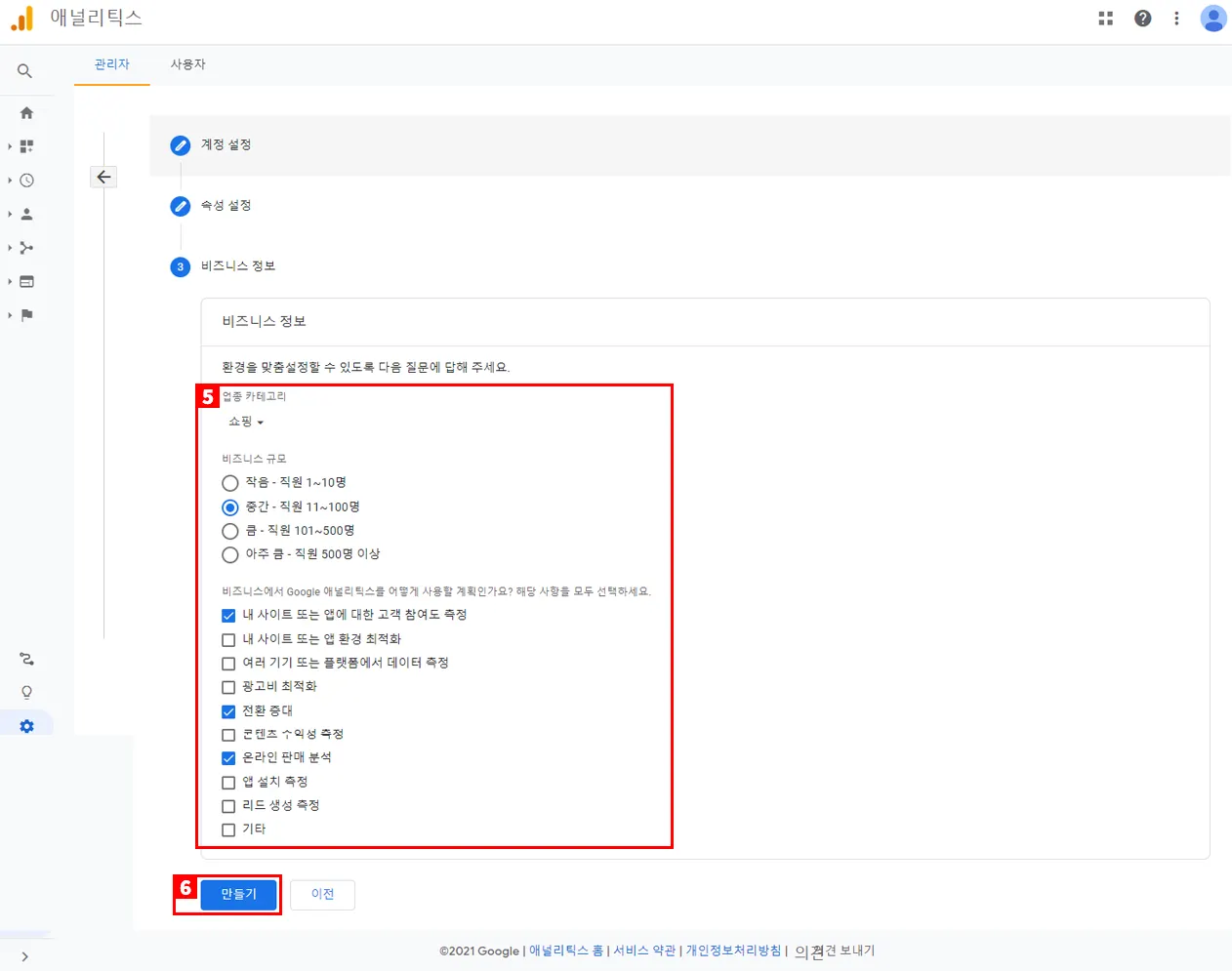5) 비즈니스 정보를 업종과 규모에 맞게 선택하여 입력 합니다.