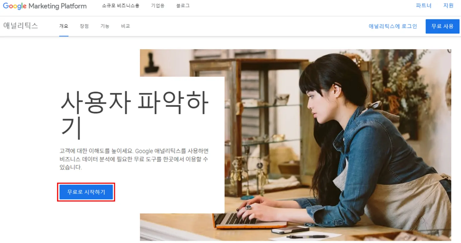 구글 애널리틱스에 접속 후 ‘무료로 시작하기’를 클릭 합니다.