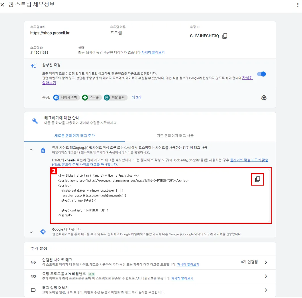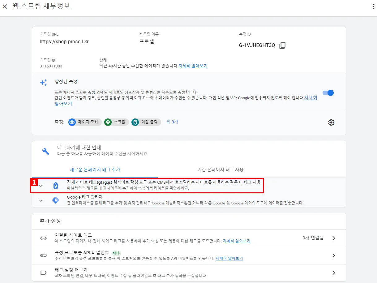 1) 데이터 스트림을 만든 후 세부정보에서 태그하기에 대한 안내 > ‘이 태그 사용’을 클릭 합니다.