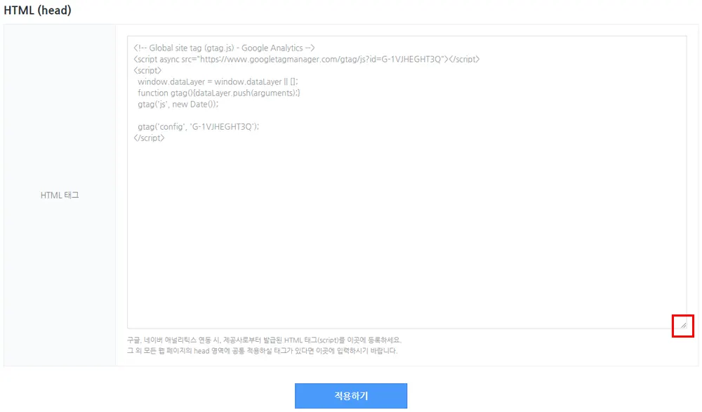 ※ 더 많은 태그 소스를 삽입하거나 편집 시 입력폼의 우측 하단 모서리를 마우스로 클릭 및 드래그