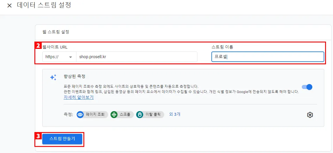 2) 웹사이트 URL에 쇼핑몰 도메인과 스트림 이름에 쇼핑몰명을 입력 합니다.