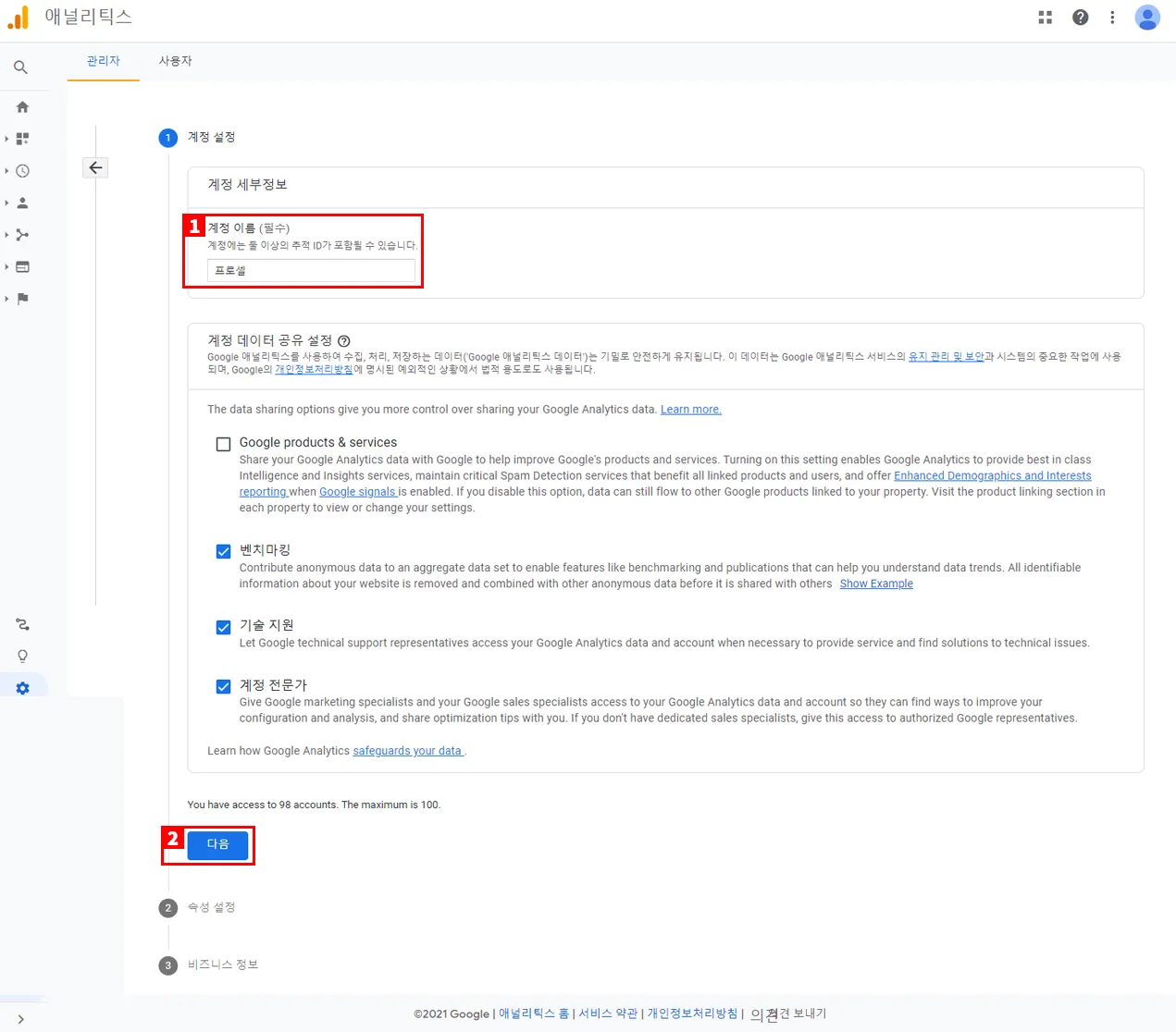 1) 관리할 구글 애널리틱스의 계정 이름을 입력 합니다. 쇼핑몰명 또는 솔루션명으로 분류 합니다.
