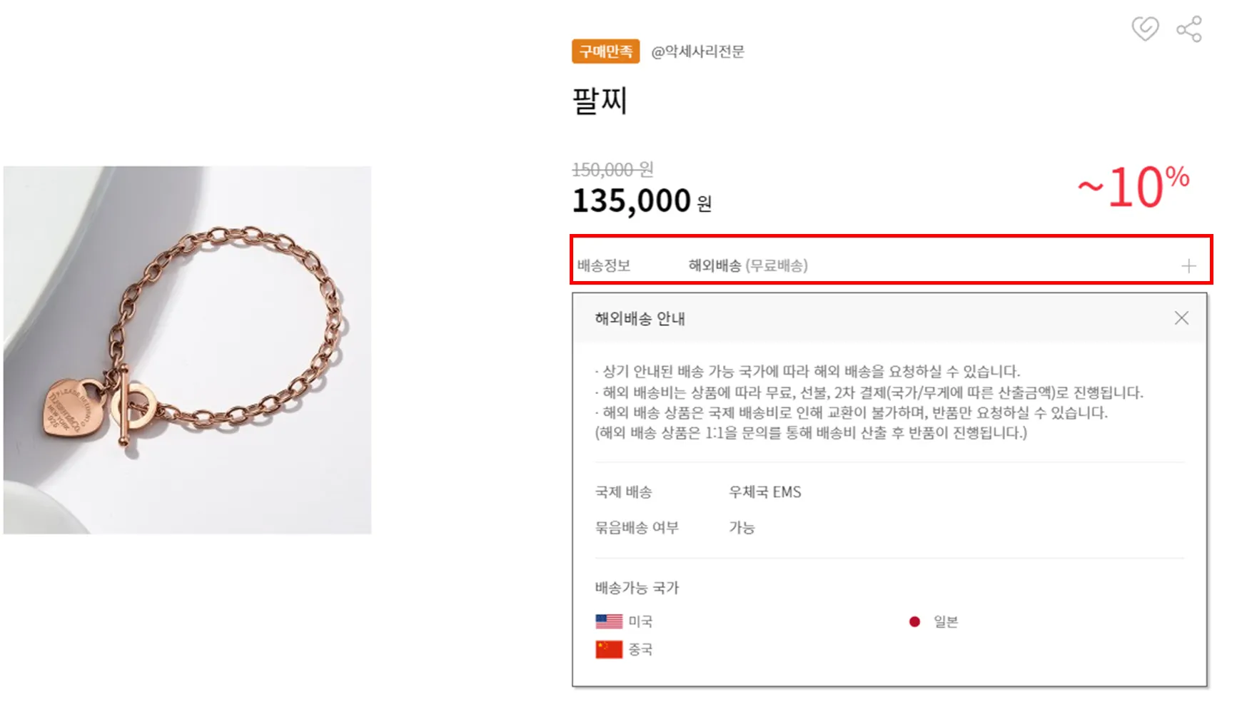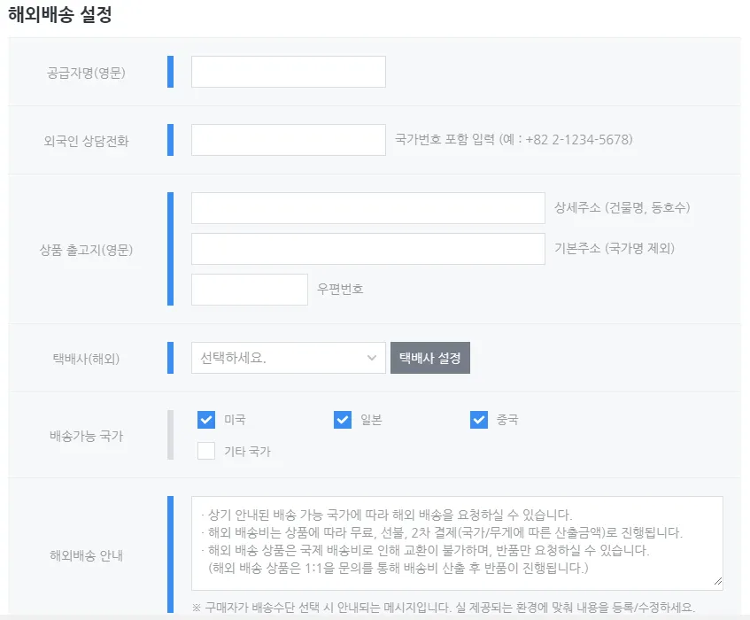 해외배송 안내 : 상품페이지에 노출되는 해외배송 안내 메세지를 입력합니다.