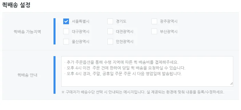 퀵배송 안내 : 상품페이지 배송정보에 노출되는 퀵배송 안내 메세지를 입력합니다.