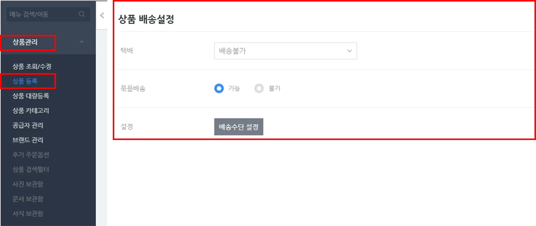 상품관리 > 상품 등록 > ‘상품 배송설정’ 설정 화면