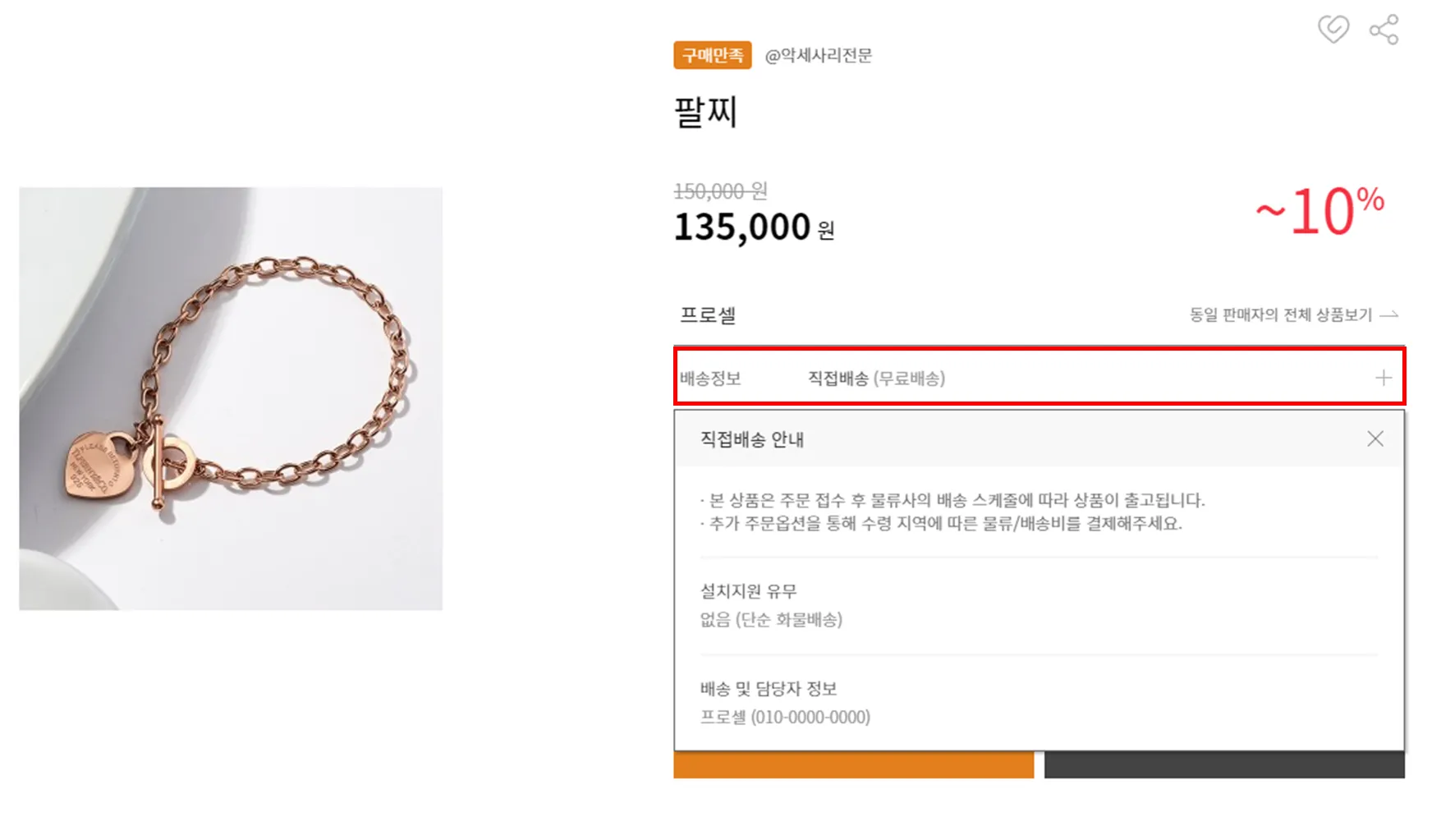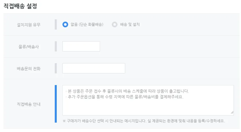직접배송 안내 : 상품페이지 배송정보에 노출되는 직접배송 안내 메세지를 입력합니다.