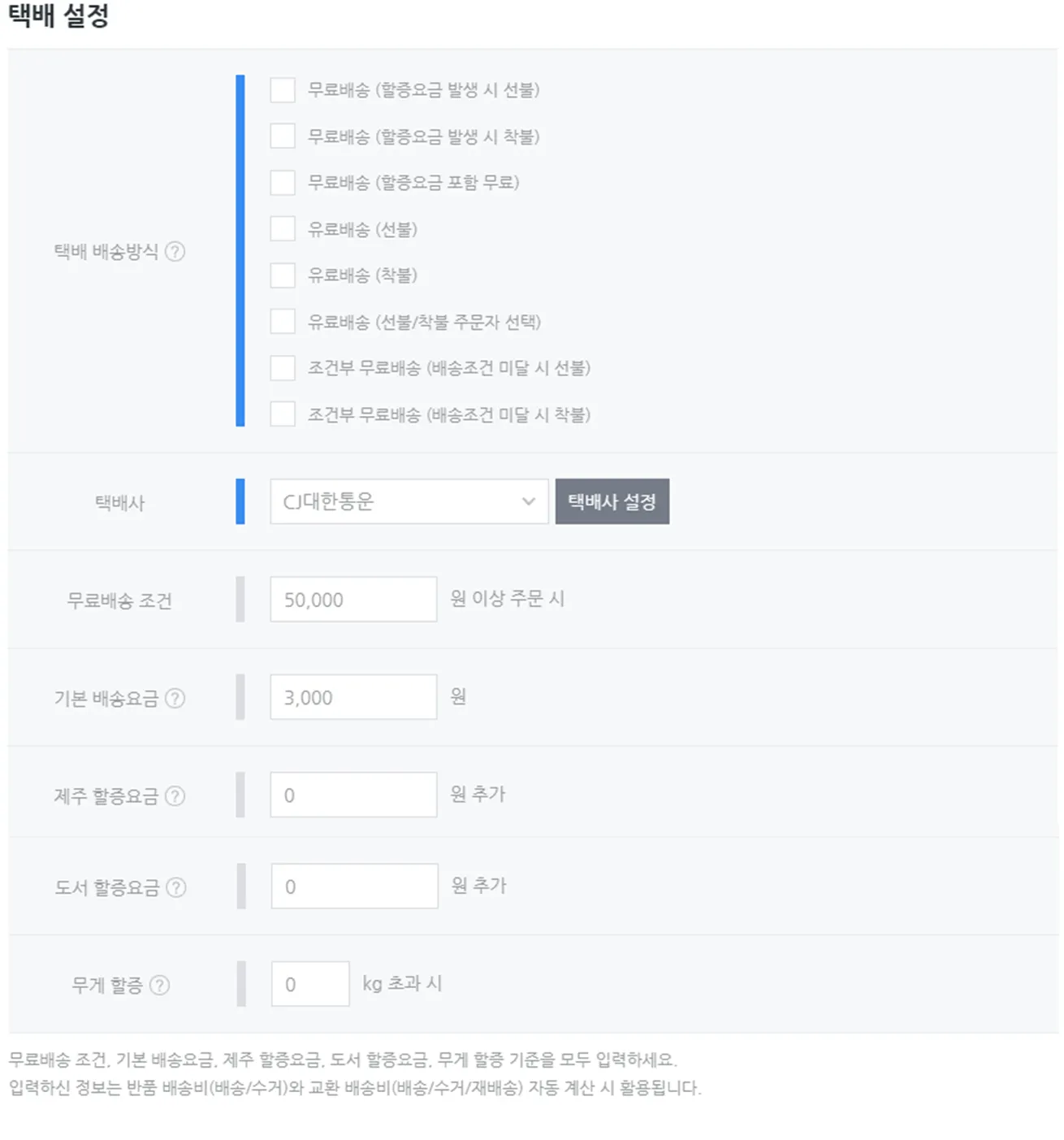 택배 배송방식 : 택배 배송 방식을 설정합니다.