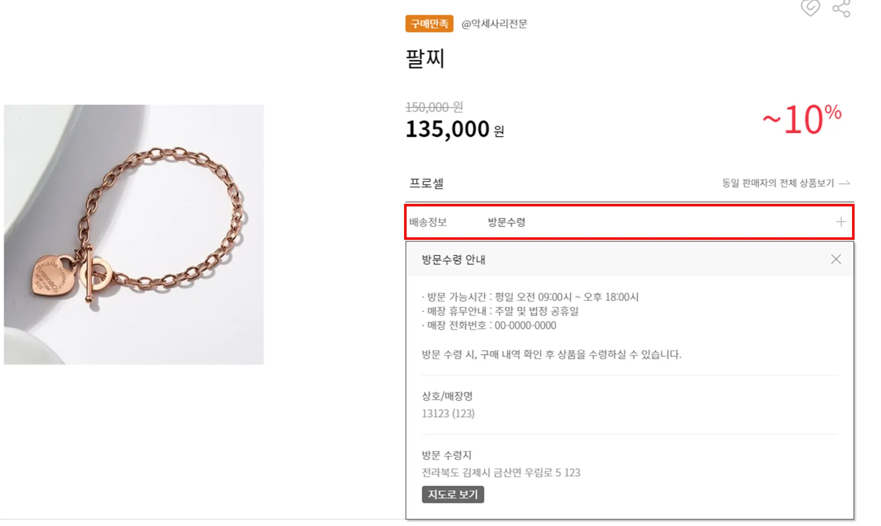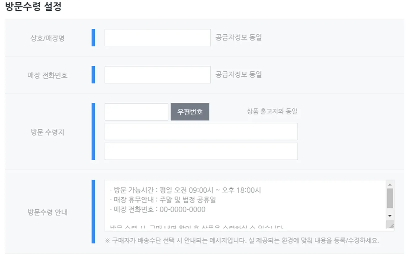 방문수령 안내 : 상품페이지 배송정보에 노출되는 방문수령 안내 메세지를 입력합니다.