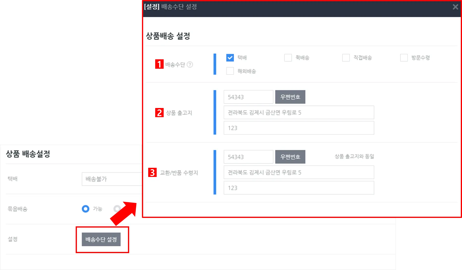 ③ 교환/반품 수령지 : 상품을 반송받는 지역을 설정합니다.
