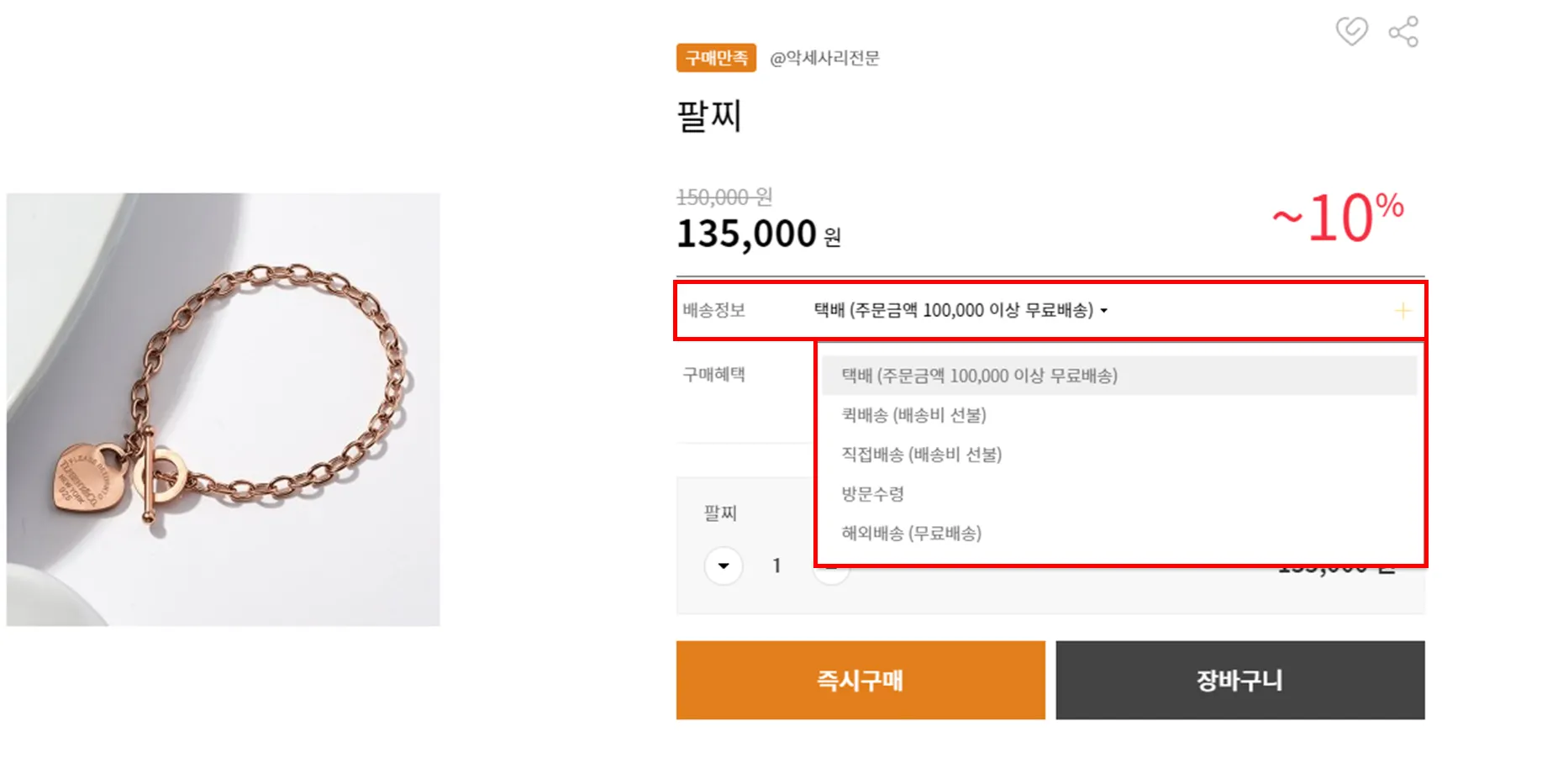 4) 상품에 여러가지 배송수단을 등록했다면 고객은 원하는 배송방식을 상품페이지 > 배송정보 메뉴를 클릭해서 선택할 수 있습니다.