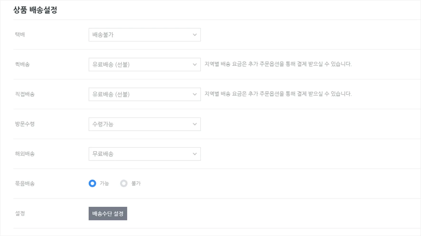 3) ‘배송수단 설정’이 완료되었다면 상품 배송설정 메뉴에서 원하는 배송 방법을 선택하여 상품을 등록할 수 있습니다.