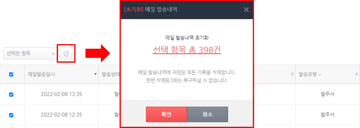 6) 초기화 버튼을 클릭하면 발송된 모든 메일을 삭제할 수 있습니다.