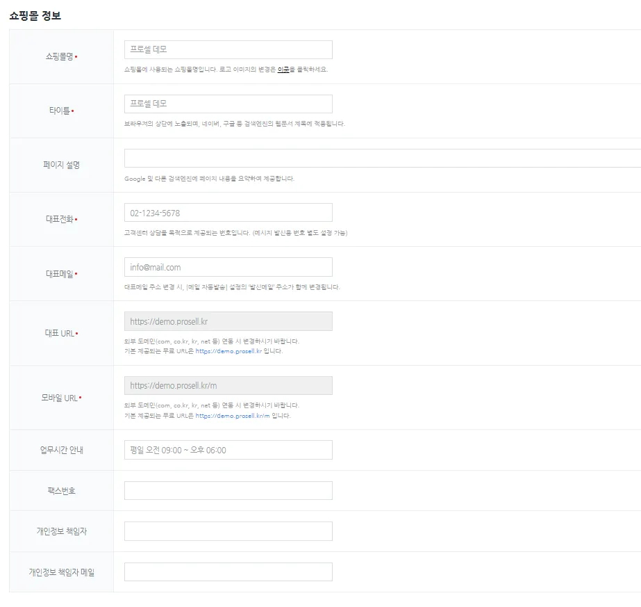 경로 : 쇼핑몰 설정 > 쇼핑몰 정보