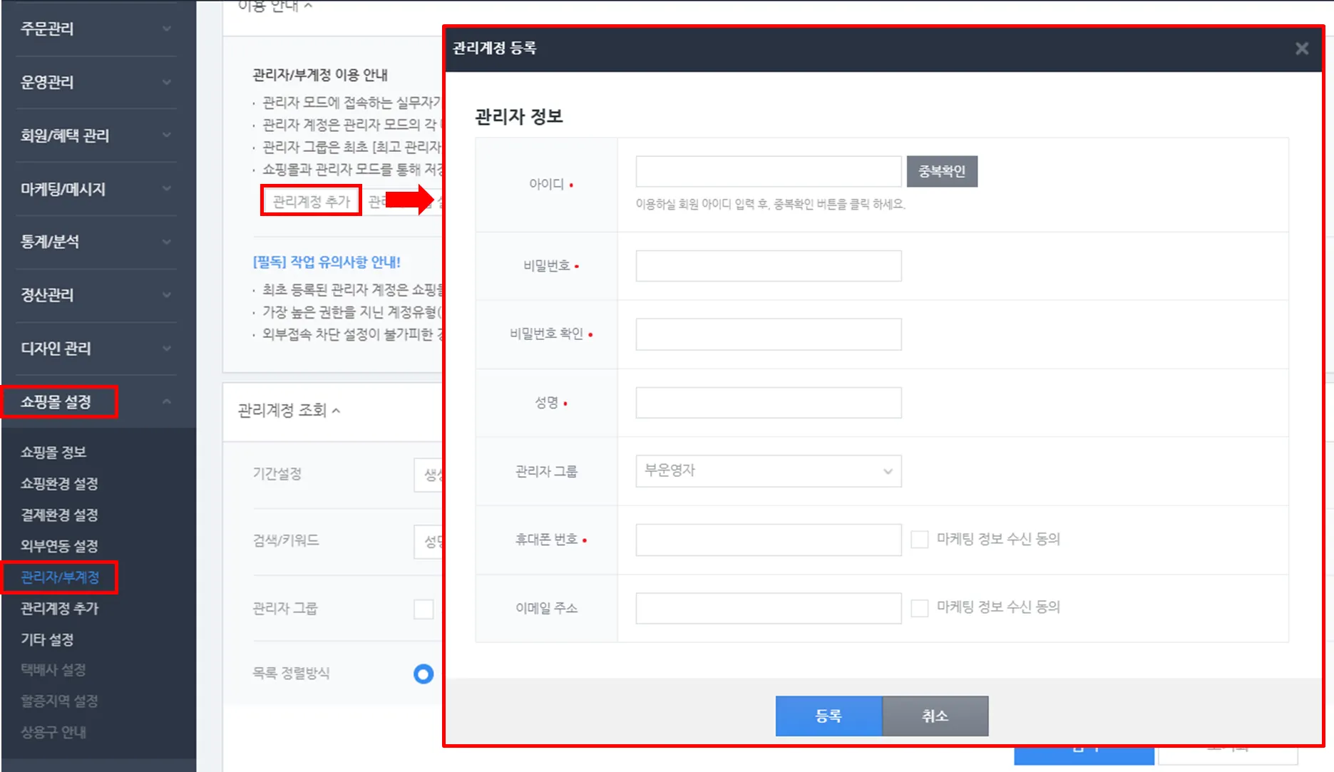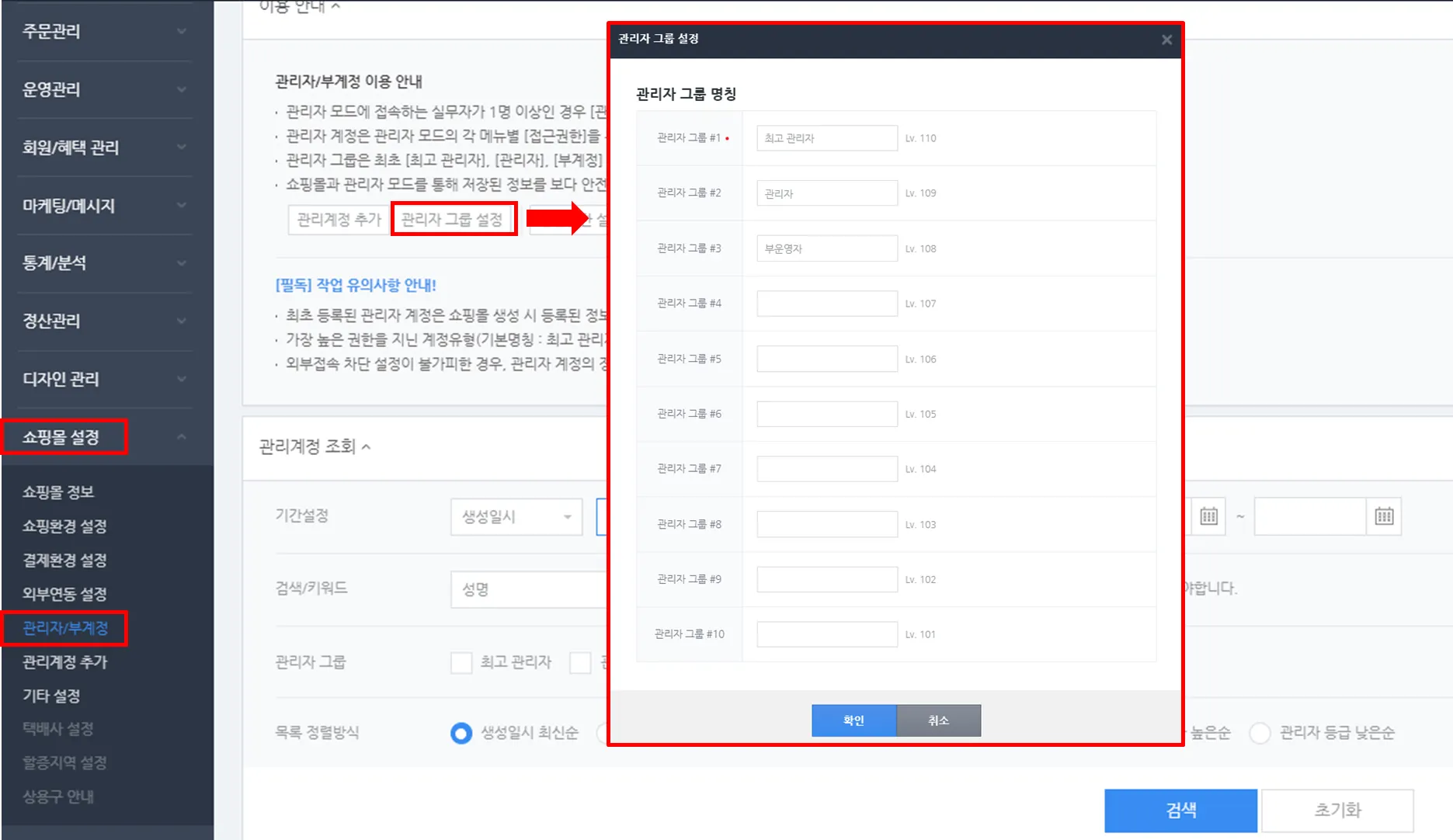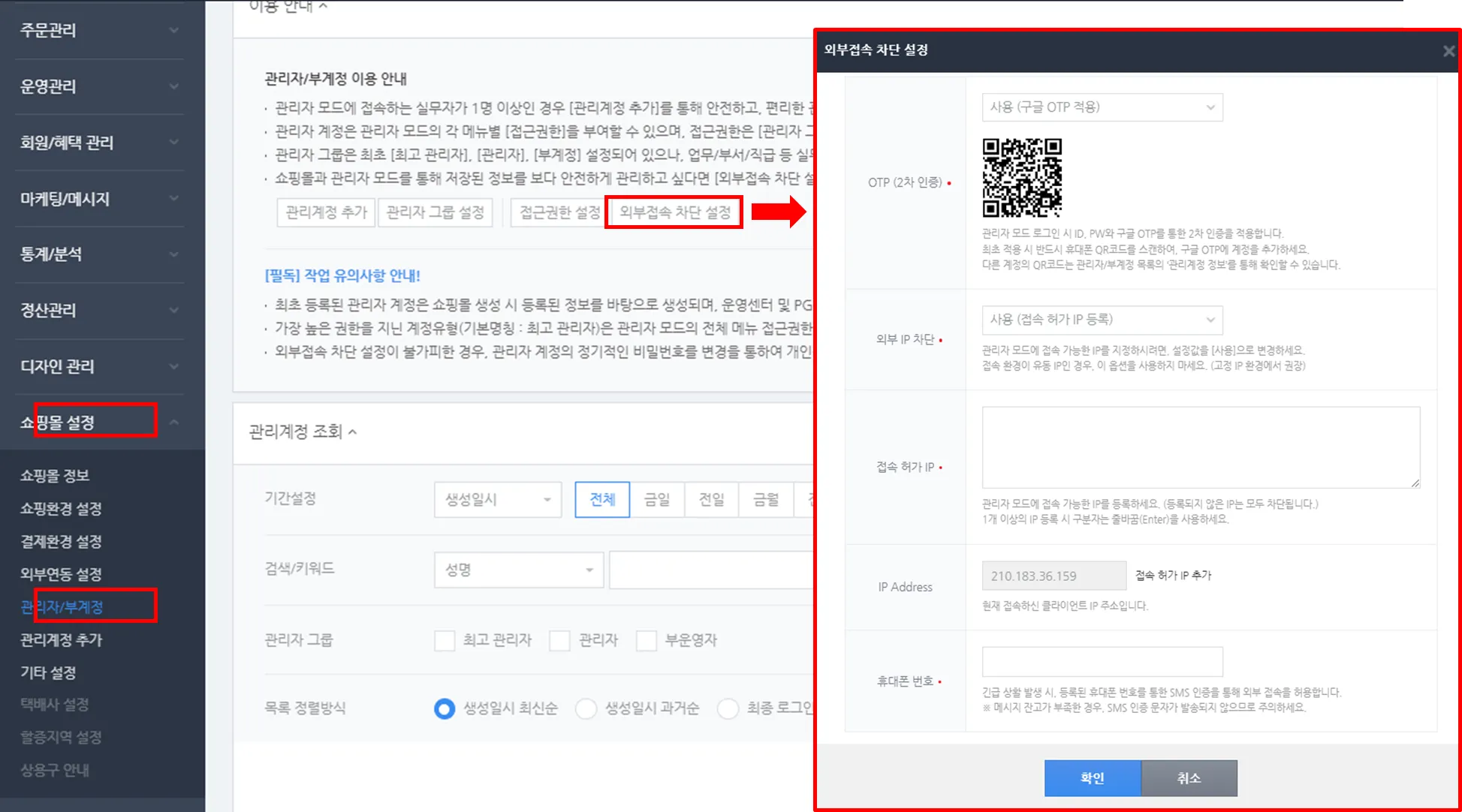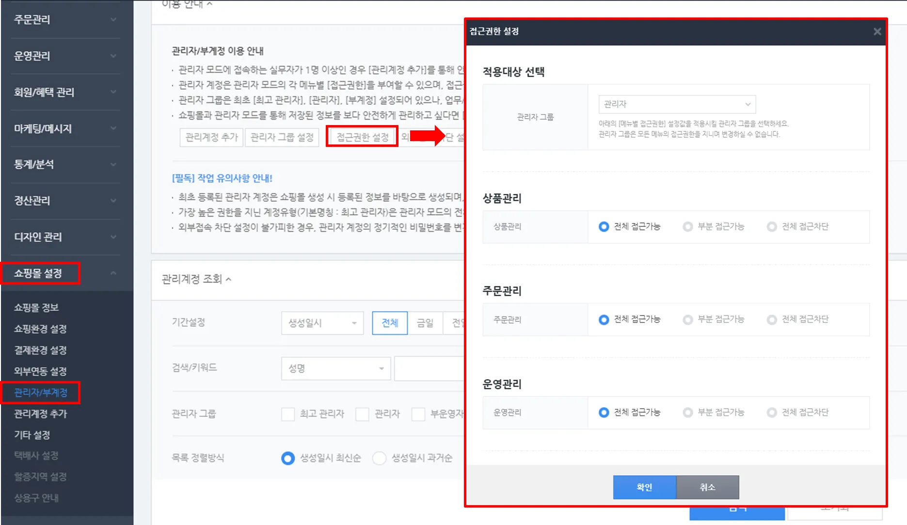 경로 : 쇼핑몰 설정 > 관리자/부계정