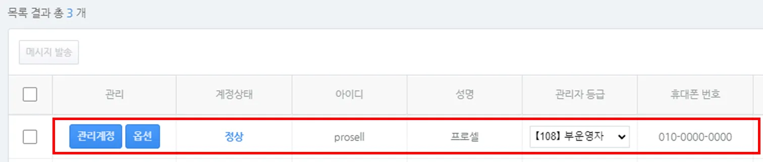 2) 관리자 정보 등록이 완료되면 ‘목록 결과’ 화면에서 등록된 계정 정보를 확인할 수 있습니다.