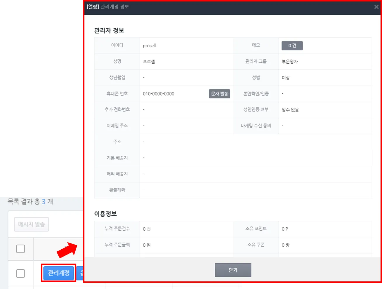 1) ‘목록 결과’ 화면에서 등록된 관리자의 ‘관리계정’ 버튼을 클릭하면 등록된 관리자 정보를 확인할 수 있습니다.