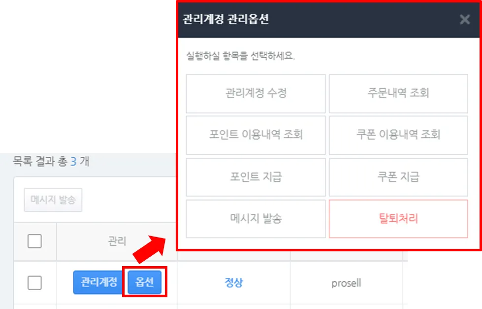 2)’옵션’ 버튼을 클릭하면 ‘관리계정 수정’, ‘주문내역 조회’, ‘포인트 이용내역 조회’, ‘쿠폰 이용내역 조회’, ‘포인트 지급’, ‘쿠폰 지급’, ‘메세지 발송’, ‘탈퇴처리’ 기능이 제공됩니다.