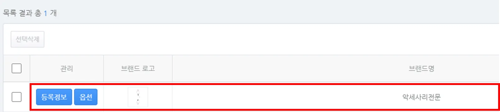 3) 등록이 완료되면 '목록 결과' 화면에서 등록된 브랜드 목록을 확인할 수 있습니다.