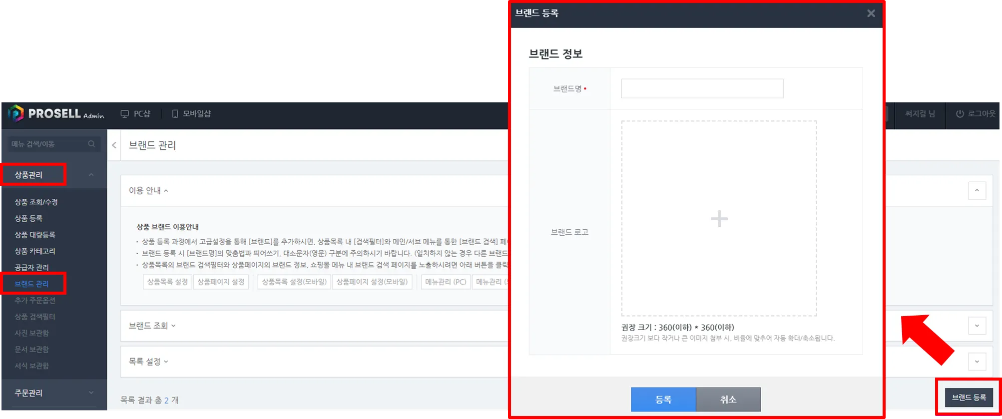 1) [상품관리 > 브랜드 관리] 메뉴에서 '브랜드 등록' 버튼을 클릭하고 '브랜드 정보'를 입력합니다.