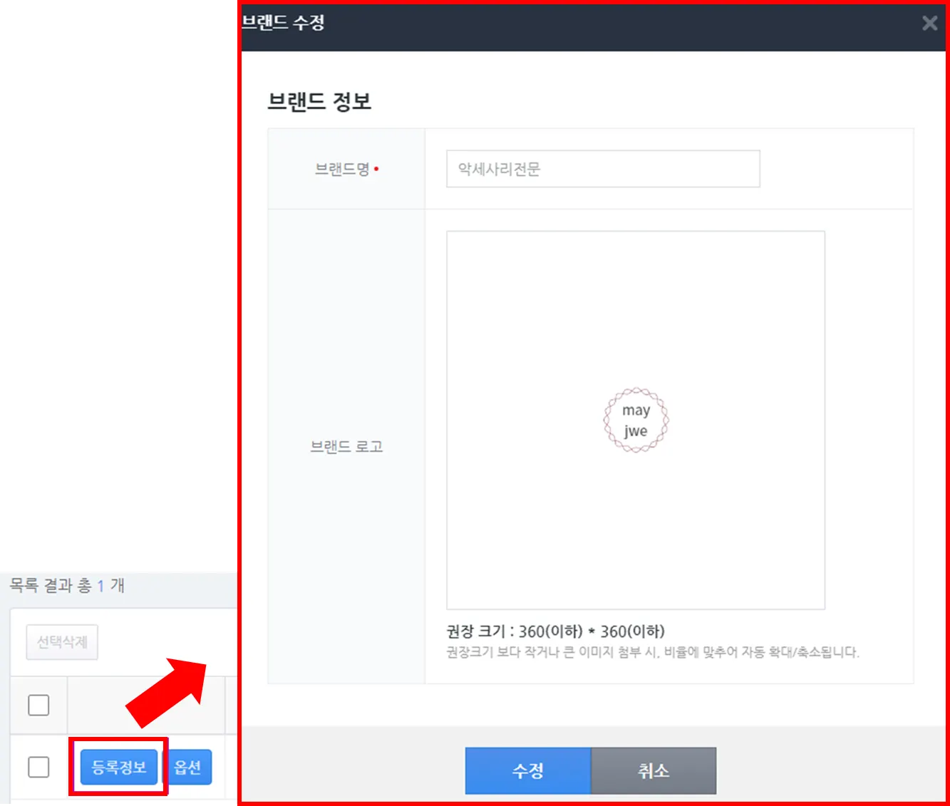 4) 등록된 브랜드의 '등록정보'를 클릭하면 '브랜드명','브랜드 로고'를 수정할 수 있습니다.