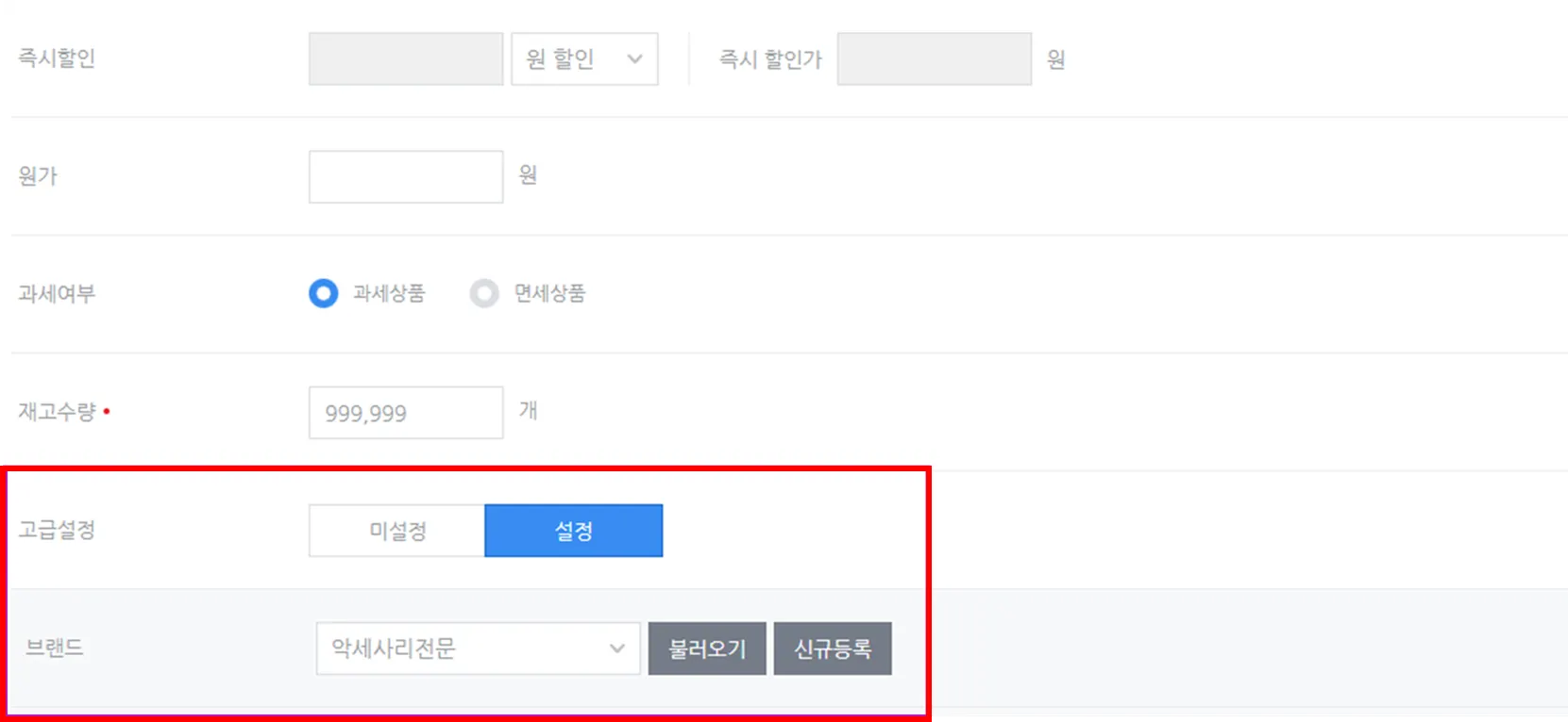 1) 상품 등록/수정 화면에서 ‘고급설정’ 기능을 설정으로 변경 후 상품 브랜드를 등록할 수 있습니다.