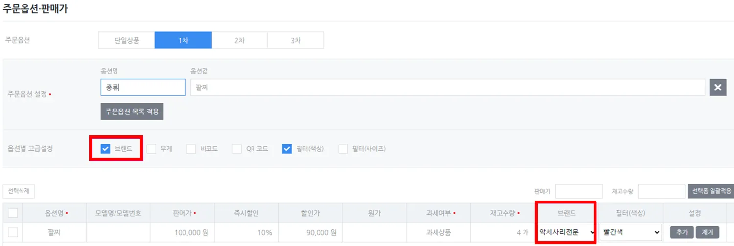 주문옵션 기능을 설정하면 ‘브랜드’ 기능의 설정 위치가 변경됩니다.