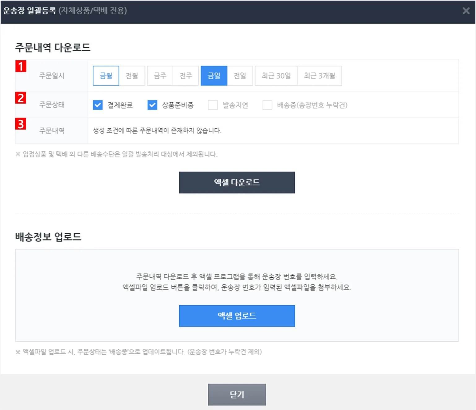 ② 주문상태 : 결제완료, 상품준비중, 발송지연, 배송중 상태의 주문서를 다운로드할 수 있습니다.