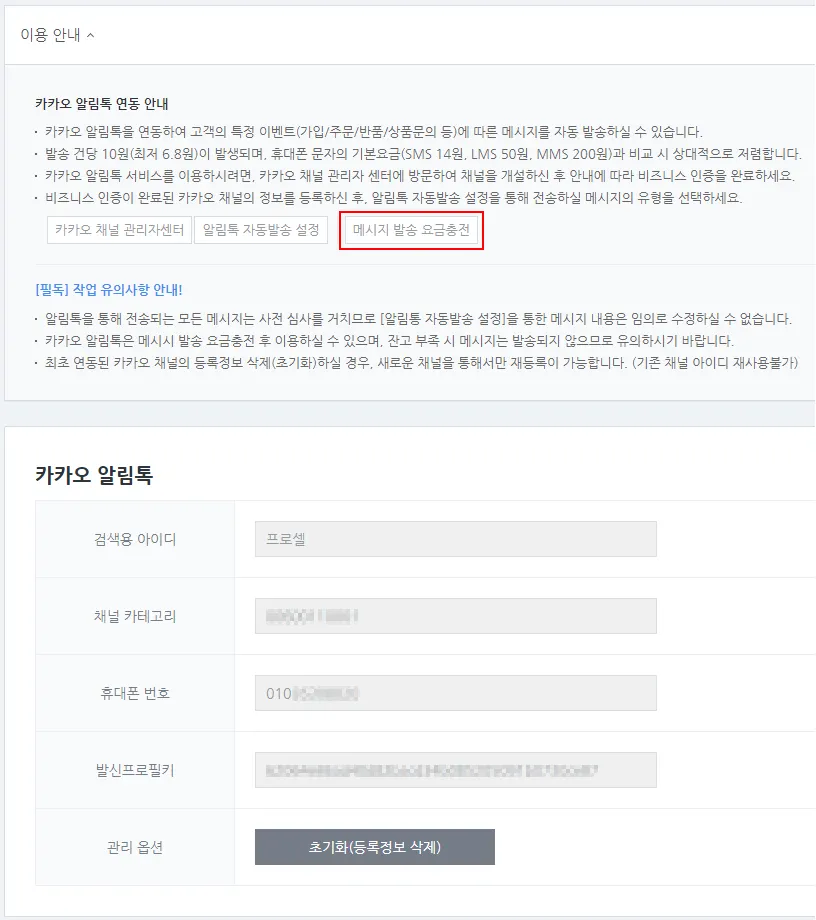 ※ 잔고가 없거나 부족한 경우, 알림톡 메시지는 발송되지 않으니 유의하시기 바랍니다.