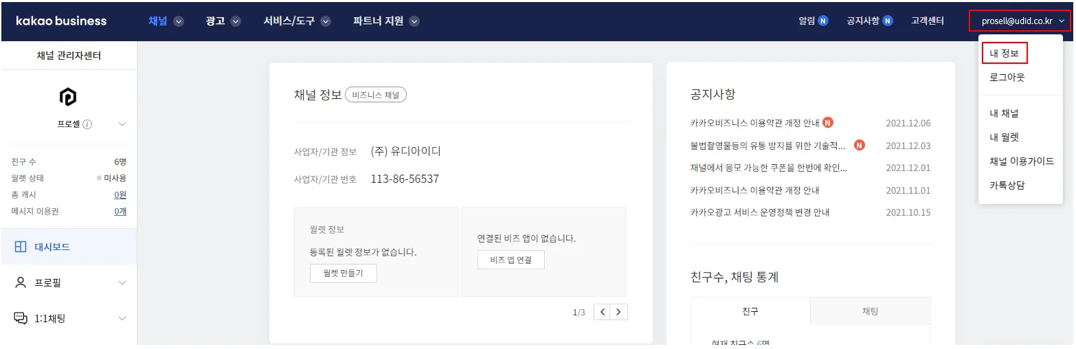 알림톡을 연동하려면 카카오 비즈니스를 통해 채널 생성 및 비즈니스 채널로 전환을 하셔야 합니다.