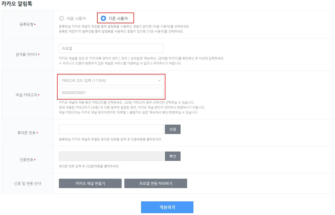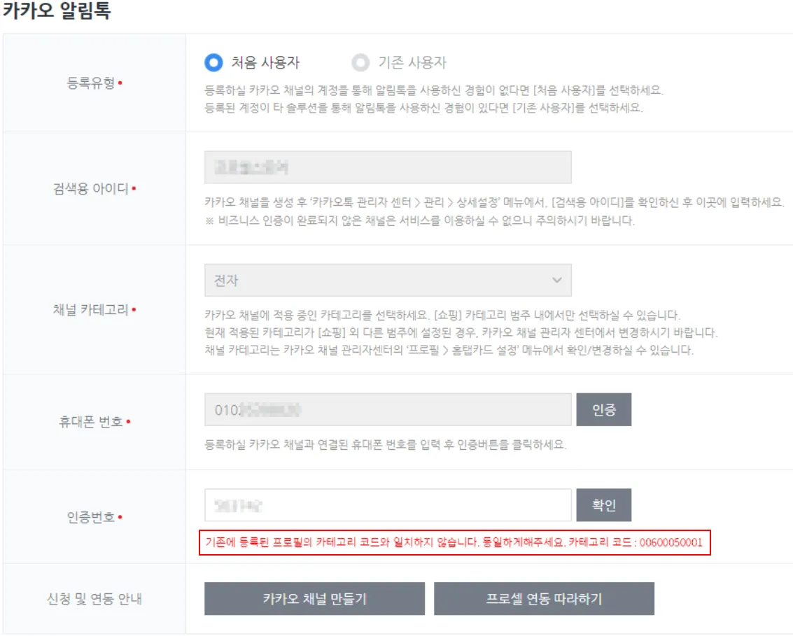 ② 해결 방법 : 등록 유형을 '기존 사용자' > 채널 카테고리를 '카테고리 코드 입력'으로 변경하여 오류