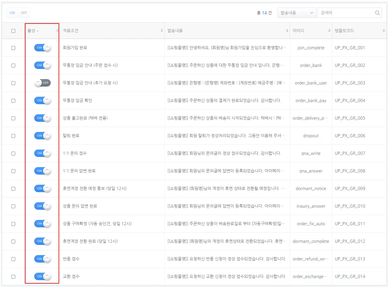 '알림톡 자동발송' 메뉴에서 사용할 메시지 항목을 ON으로 활성화 하시면 조건에 따라 알림톡이
