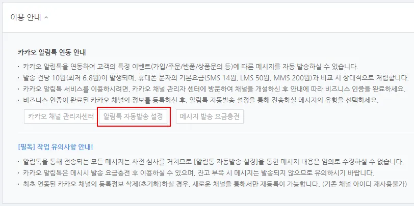 설정은 카카오 알림톡 연동 페이지 상단의 '알림톡 자동발송 설정'을 통해 하실 수 있습니다.