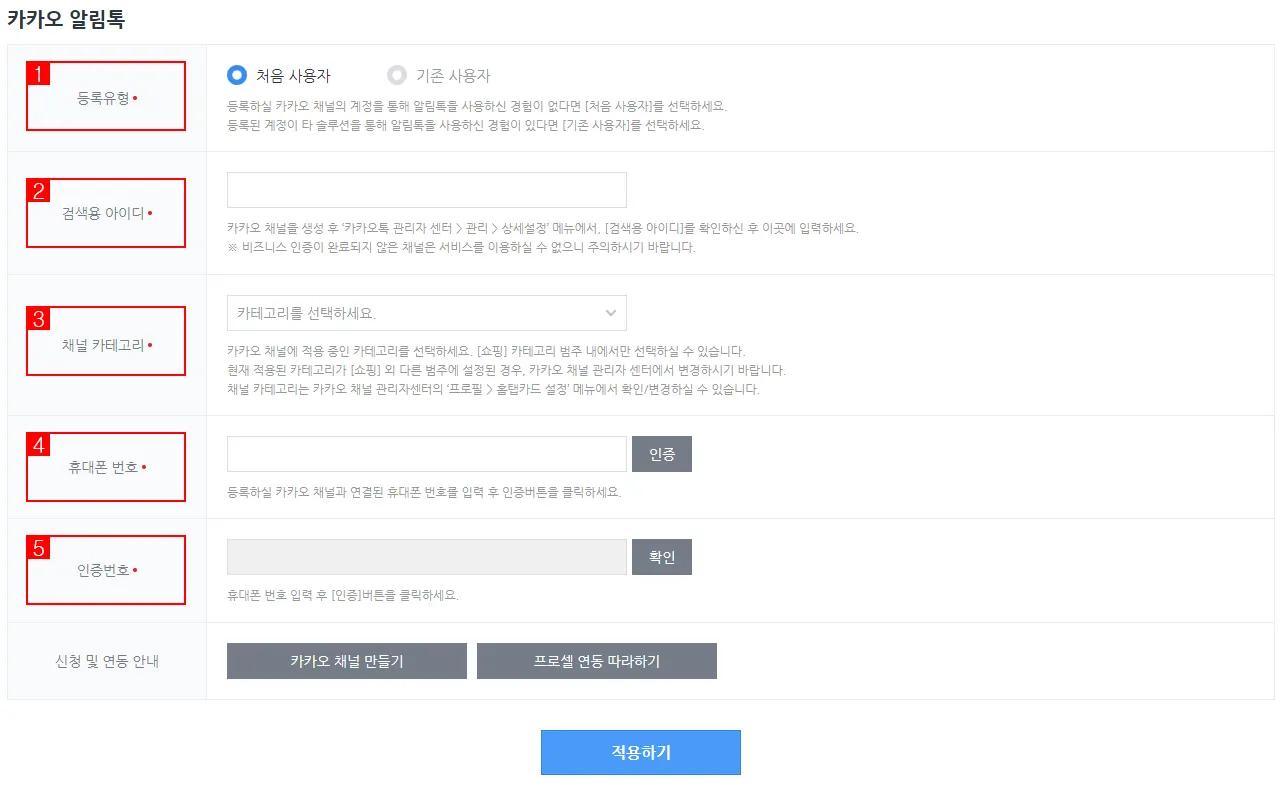 1) 등록유형 : 신규 개설한 채널은 '처음 사용자', 이전에 사용했던 채널은 '기존 사용자'로 선택해