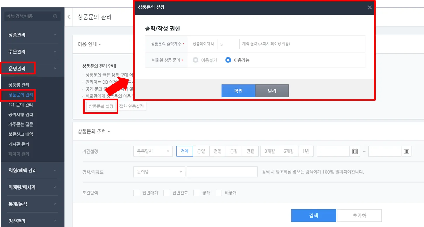 ※ 상품문의 관련 기능 설정 및 관리 메뉴입니다.