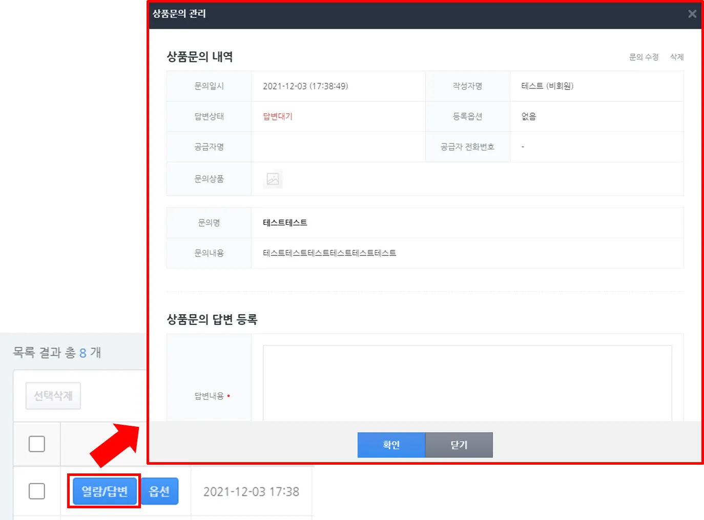 팝업 화면에서 상품문의 내용을 확인할 수 있으며, 문의 수정, 삭제 , 답변이 가능합니다.