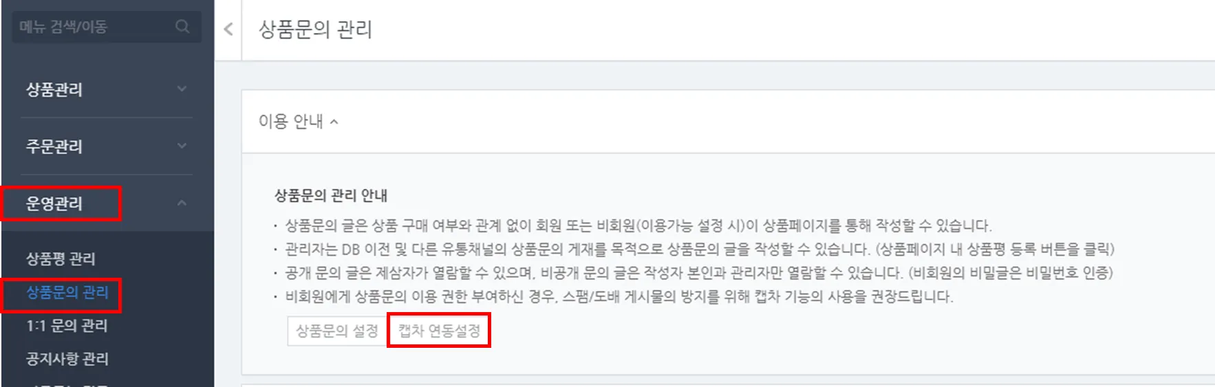 3) [운영관리 > 상품문의 관리] 메뉴에서 ‘캡차 연동설정’ 버튼을 클릭하면 캡차 설정 화면으로 이동할 수 있습니다.