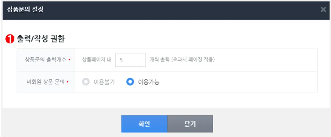 상품문의 출력개수 : 1페이지에 노출되는 상품문의 개수를 입력합니다.