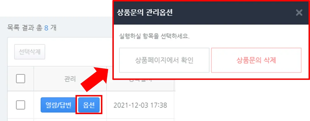 2) 상품문의 ‘옵션’ 버튼을 클릭하면 ‘상품문의 관리옵션’ 기능을 사용할 수 있습니다