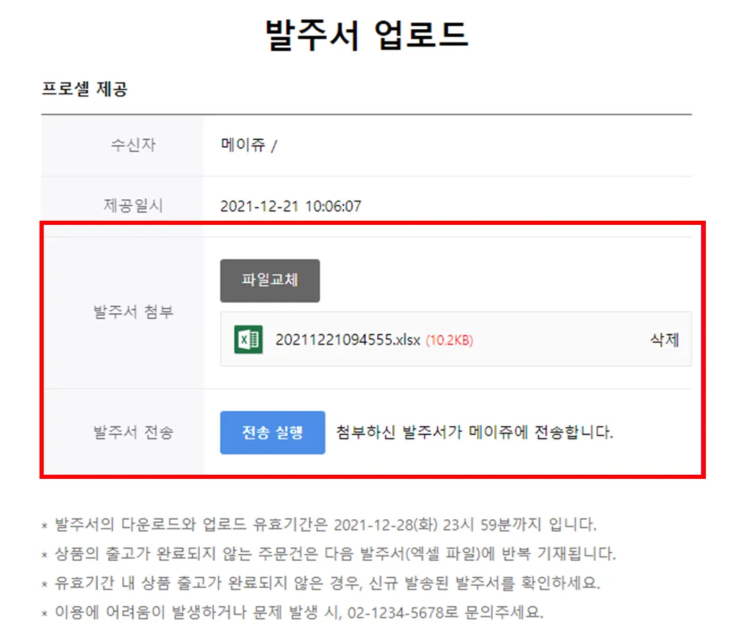 ④ 발주서 업로드 후 ‘전송 실행’ 버튼을 클릭하면 발주서 전송이 완료됩니다.