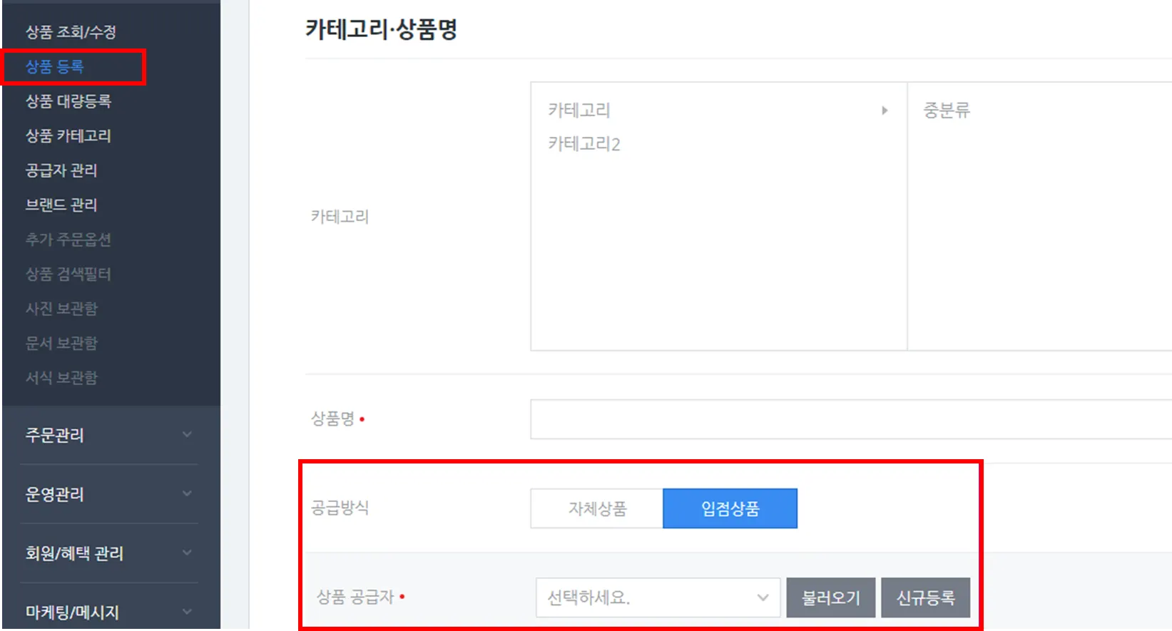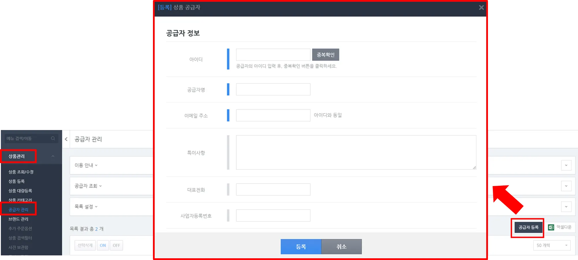 1) [상품관리 > 공급자 관리] 메뉴에서 '공급자 등록' 버튼을 클릭하고 '공급자 정보'를 입력합니다.