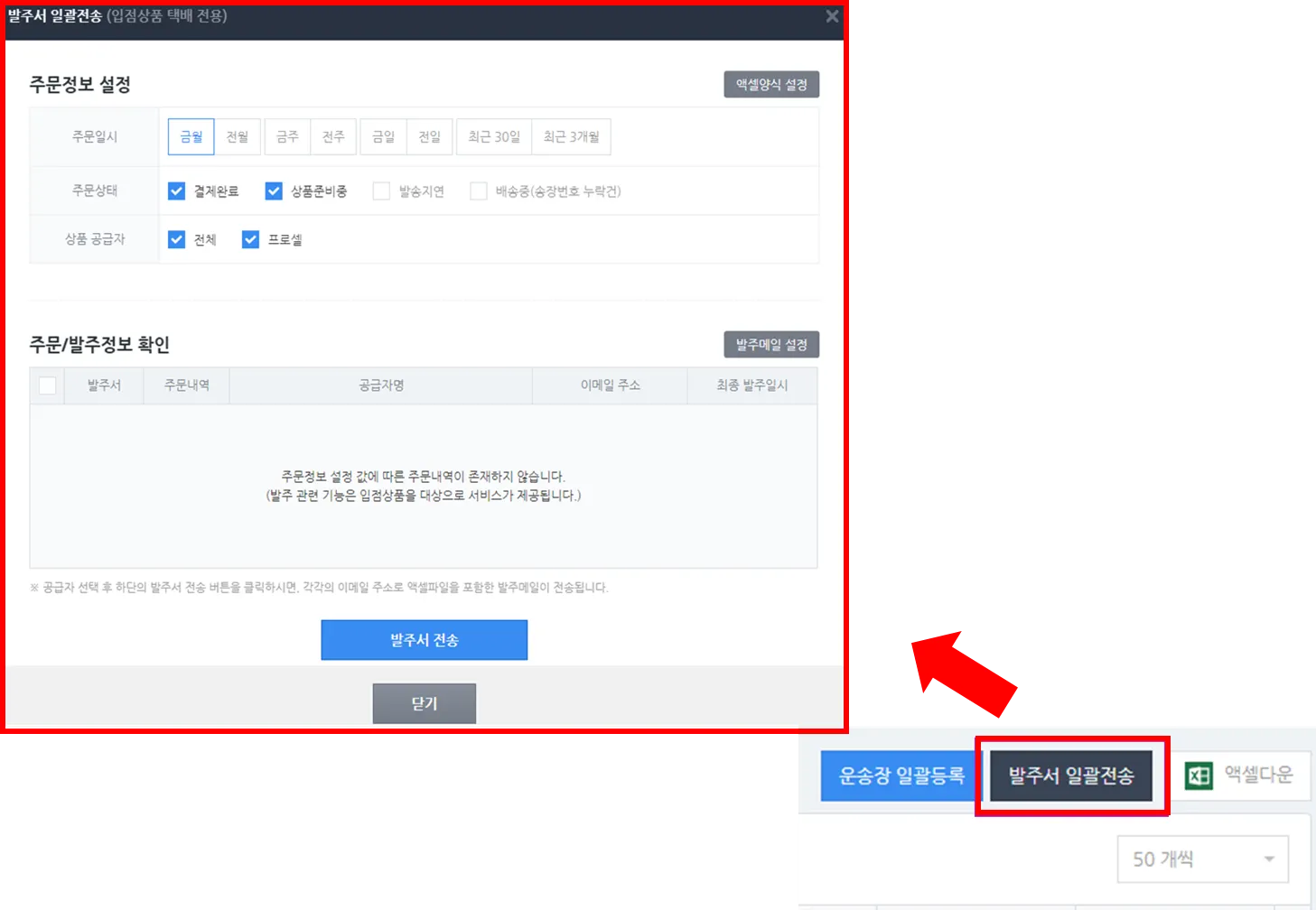 1) [주문관리 > 주문 조회] 에서 ‘발주서 일괄전송’ 버튼을 클릭하면 발주서 전송이 가능한 주문 목록을 체크해서 발주서를 수동으로 전송할 수 있습니다.