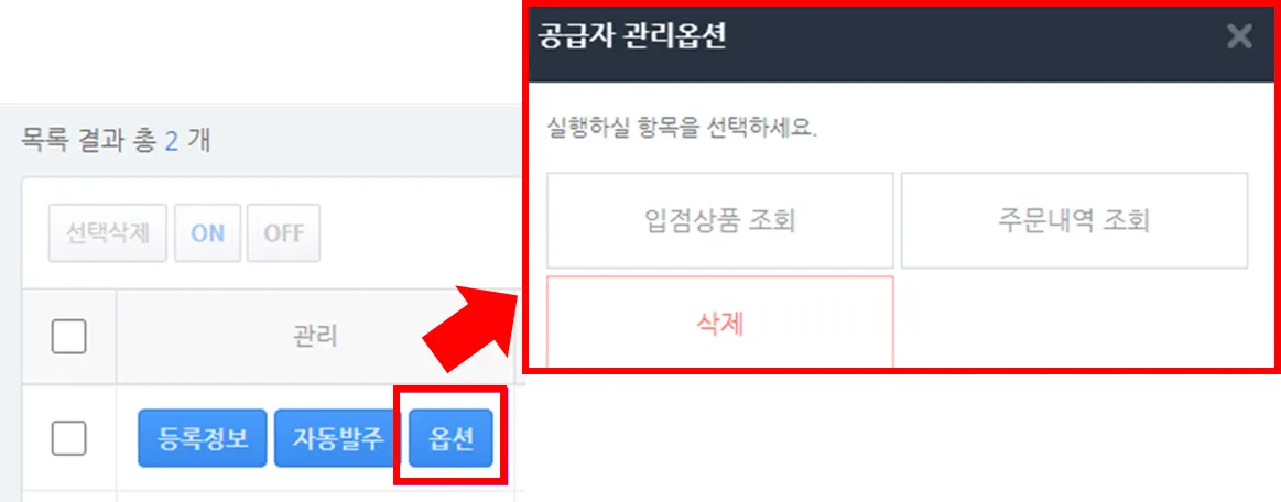 2) '옵션'을 클릭하면 ‘공급자 관리옵션’ 기능을 사용할 수 있습니다.