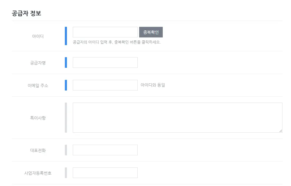 아이디 , 공급자명, 이메일 주소, 특이사항 ,대표전화, 사업자 등록번호를 입력 합니다.