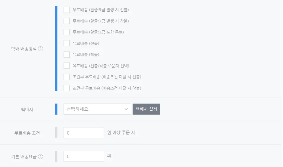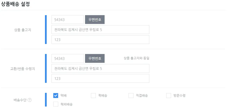 상품 출고지, 교환,반품 수령지, 배송수단을 설정합니다.